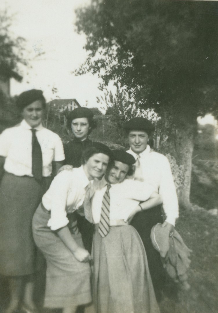 Informazio osagarria:Neska lagun-taldea Torosto mendian. Goian, ezkerretik: Edurne Ariño, Herminia Lazpita, Vitoria Zabala. Behean ezkerretik: Anunciacion Lasuen eta Inmaculada Lasarte.
