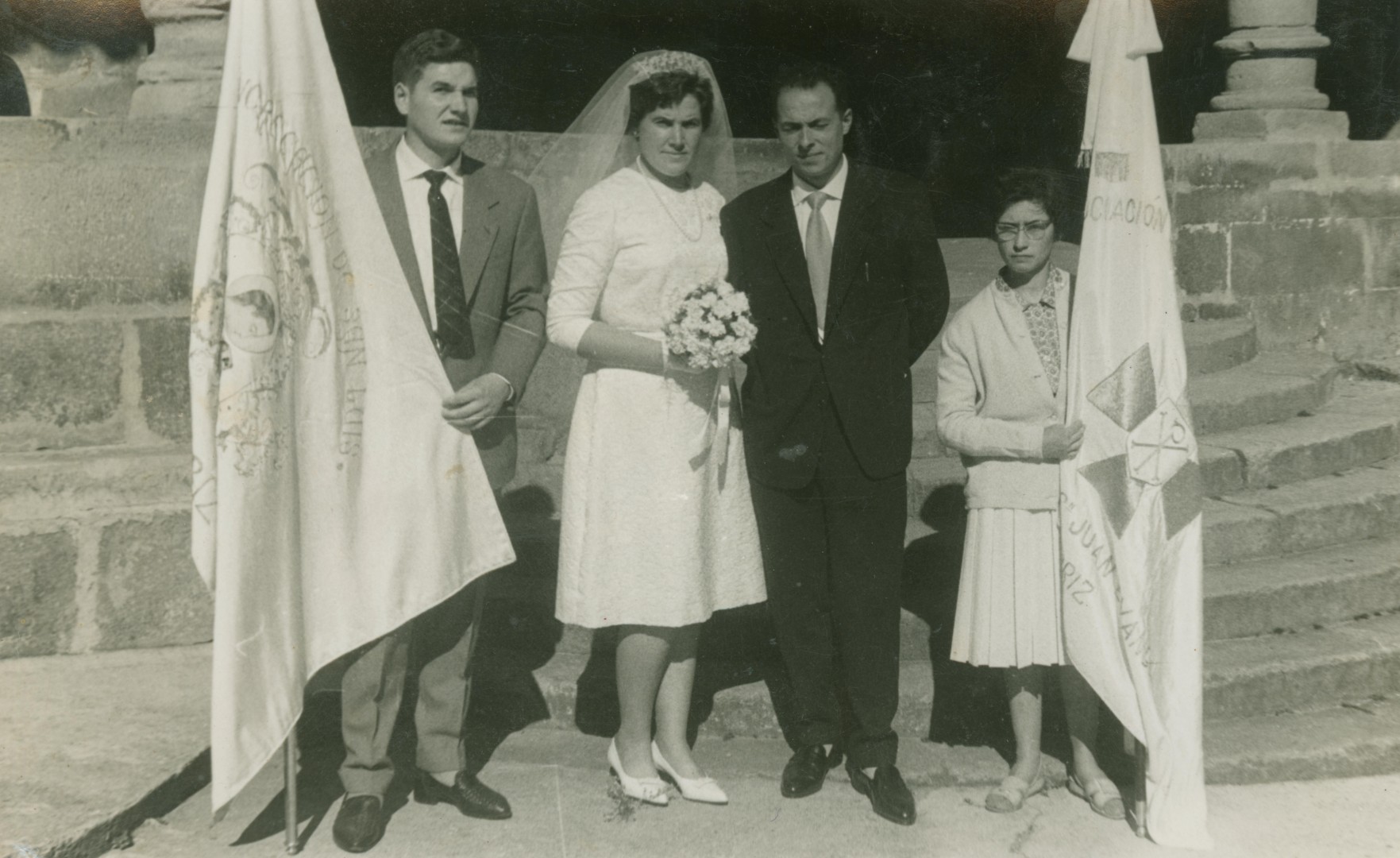 Informazio osagarria:Felisa Unzueta eta Juanito Lasuenen ezkontza. Roberto Unzueta, Luistarren banderarekin, eta Herminia Lazpita, Mariaren Alaben estandartearekin. San Juan Ebanjelaria parrokiaren aurrean ateratako argazkia da.