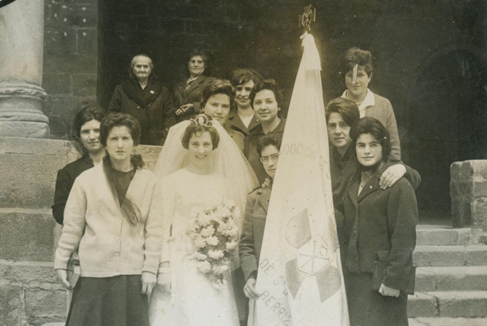 Informazio osagarria:Miren Angiozarren ezkontza. Herminia Lazpita (banderarekin), Clarita Retolaza (behean, ezkerrean lehenengoa), beste batzuren artean: Maritere Aranoa, Rosario Unzueta, Juanita, Felisa Unzueta, Pilar Gorritxategi. San Juan Ebanjelaria parrokiaren aurrean ateratako argazkia.