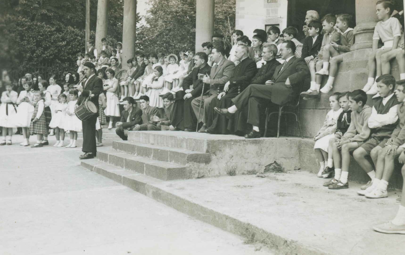 Informazio osagarria:Don Vicente Urkiza parrokoaren despedida. Eserita: (...), Pedro Mari Azpiri (alkatea), Vicente Urkiza (abadea), (Don Pedro ... (abadea), Jose Maria Odiaga. Txistularia: Alejandro Aldekoa. Elizaurren ateratako argazkia.